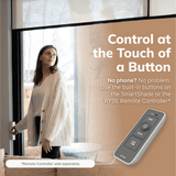 Elegant RF remote that works through walls. Controls both Shade Motor and Curtain Motor — no phone or app required. Pair in seconds, open/close/stop with a single click. 2 x AAA battery powered.