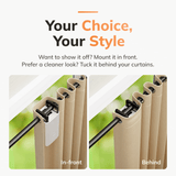 Works front or behind curtain — compatible with virtually any standard curtain track, rod, or U-rail.