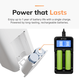 Dual rechargeable 18650 Li-Po batteries. Optional dual charger accessory. No wiring needed.